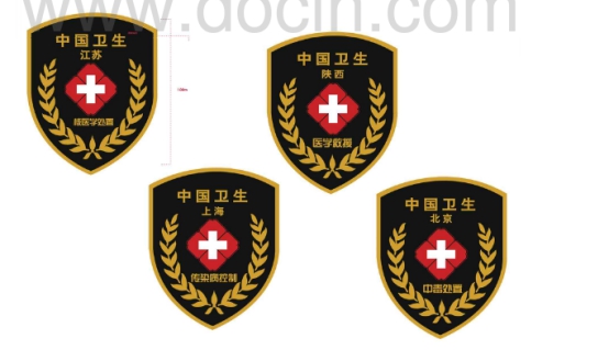 臂章正面中間位置印有“紅花白十字”,圖案上面兩行文字,***行是“中國衛生”,第二行是承建單位或隊伍所在省份名稱;圖案下面一行文字說明隊伍的處置類別(如醫學救援等);兩側設計有環繞的麥穗圖案。