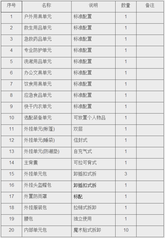 個人衛生應急裝備,是按照《衛生部衛生應急裝備參考目錄(試行)》要求“衛生應急指導函[2011]193號”,國家大型衛生應急救援工作的經驗研制開發。該裝備采用“1+X”設計理念,“1”是個人攜行基本裝備,“X”是特殊工作環境的選配單元。裝備主要由主包和幾個外掛包組成,主包內有幾個不同功能的應用單元包,外掛包用于放置帳篷、睡袋、自充氣墊、安全頭盔包等體積較大的物品。